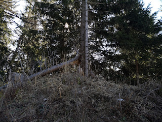 Wohl hätt ich mir ein kleines Gipfelmal erhofft, aber die, wie man so schön sagt, Hoffnung stirbt zuletzt. Mit mehr als diesem gestürzten Baum, kann ich leider nicht dienen, aber der Gipfel war das Ziel und da bin ich jetzt. Erstaunt über meine gute Verfassung heute, mache ich ein Foto und ziehe von tannen.